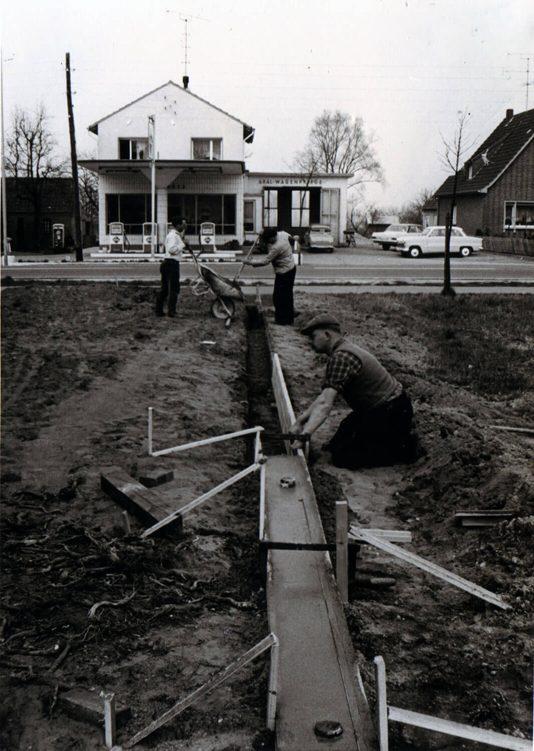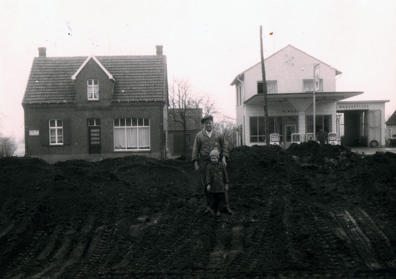 Ehel. Gerhard T. Rozijn errichten die Schreinerei mit Wohnhaus an der gegenüberliegenden Straßenseite der Werkstatt Moss an der heutigen Klever Straße 54 in Kranenburg.